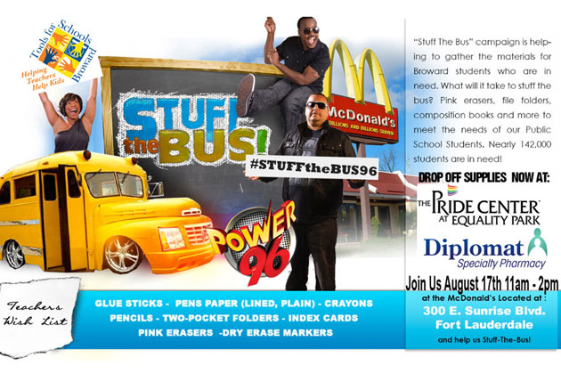 “Stuff The Bus” campaign is helping gather the materials for Broward students who are in need. What will it take to stuff the bus? Pink erasers, file folders, composition books and more to meet the Public School Students. Nearly 142,000 students are in need! Drop of your supplies at The Pride Center or at Diplomat Specialty Pharmacy.