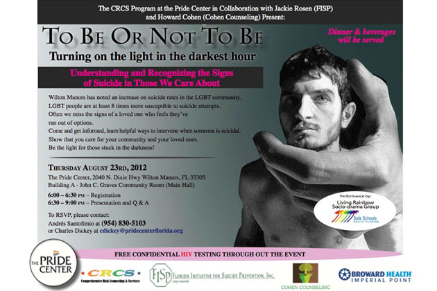 To Be Or Not To Be. Turning on the light in the darkest hour. Understanding and recognizing the signs of suicide in those we care about. Wilton Manors has noted an increase on suicide rates in the LGBT community. LGBT people are at least 8 times more susceptible to suicide attempts. Often we miss the signs of a loved one who feels they’ve ran out of options. Come and get informed, learn helpful ways to intervene when someone is suicidal. Show that you care for your community and your loved ones. Be the light for those stuck in the darkness!
