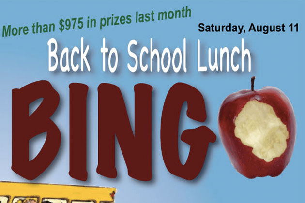 Back 2 School Lunch Bingo – Cafeteria Themed Dinner. – More than $975 in prices last month. Fundraiser dinner $12, Game Package $15. Bring school supplies and get a free raffle ticket for a gift card. Dinner proceeds go to backpack drive and new popcorn machine.