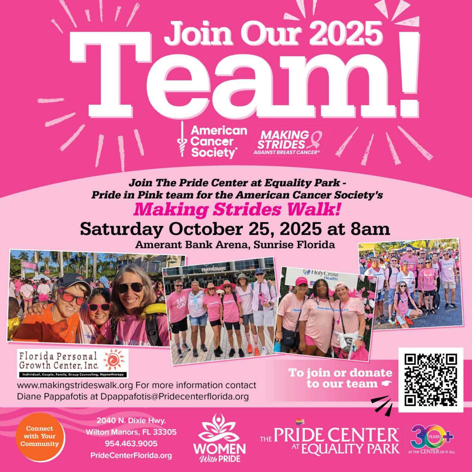 ![]() Making Strides Walk!October 25, 2025 The Pride Center 2040 N. Dixie Hwy, Wilton Manors, FL 33305 954-463-9005 |