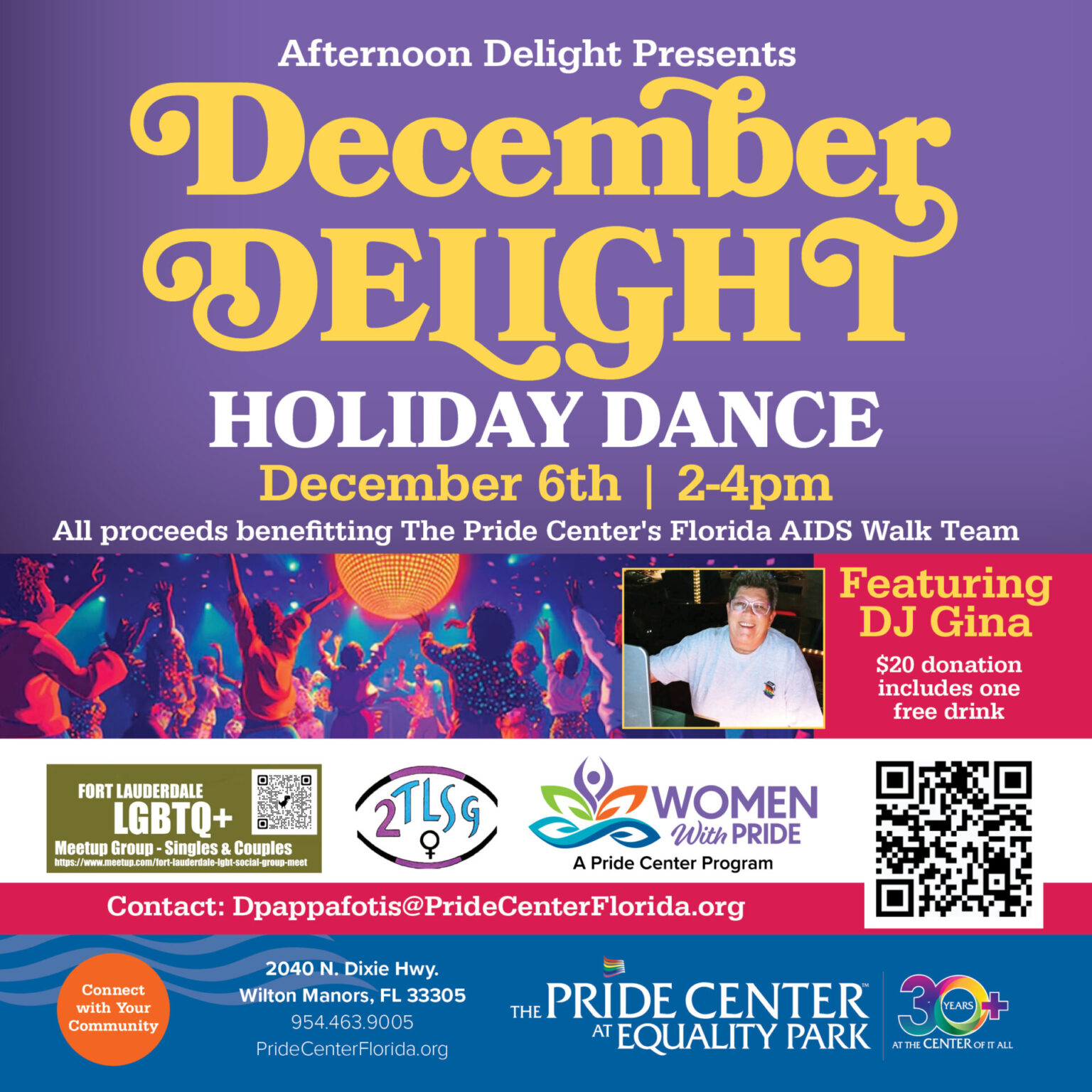 Afternoon Delight – December Delight Holiday DanceDecember 6, 2025 FREE! The Pride Center 2040 N. Dixie Hwy, Wilton Manors, FL 33305 954-463-9005 |