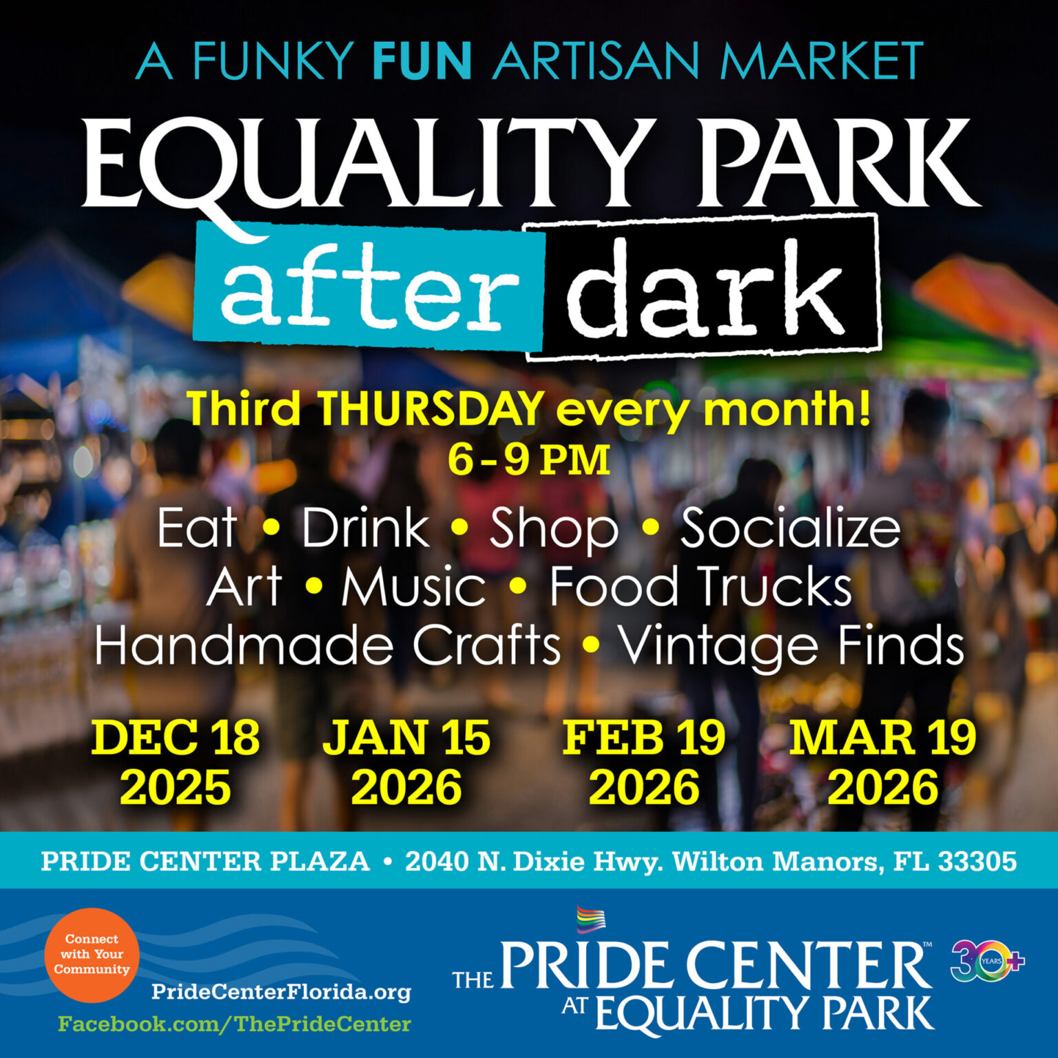 Equality Park After DarkDecember 18, 2025 FREE! Every third Thursday each month! The Pride Center 2040 N. Dixie Hwy, Wilton Manors, FL 33305 954-463-9005 |