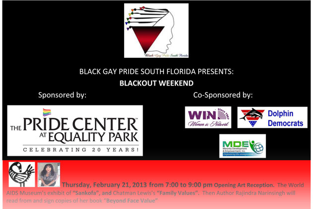 Black Gay Pride South Florida Presents: Blackout Weekend. Thursday: Art Reception, Friday: A Night of Rhytm & Words and Sunday: Old School Family Reunion Block Party