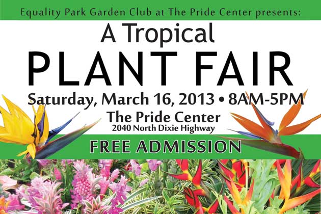 Equality Park Garden Club at the Pride Center presents A Tropical Plan Fair. Saturday March 16th 8AM to 5PM. Contact Richard for space and vendor information.