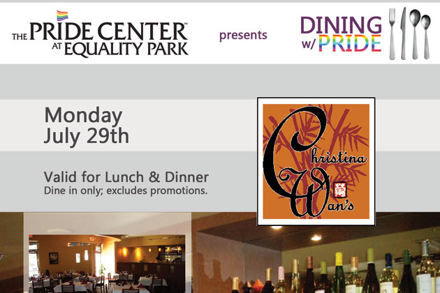 Eat at Christina Wan’s on July 29th for lunch and dinner and they will donate a percentage of your check to The Pride Center.