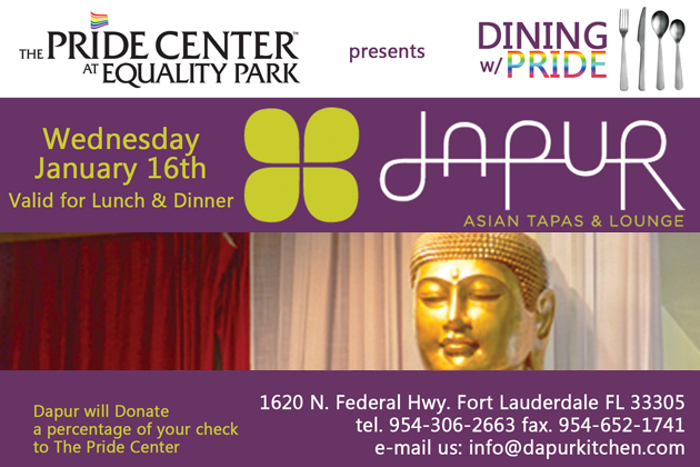 Dining with Pride at Dapur – January 16th. Dapur will donate a percentage of your check to The Pride Center. Valid for lunch & dinner.