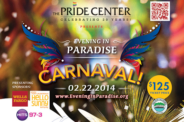 On Saturday, February 22, 2014 at 7:00pm, The Pride Center will collaborate with the City of Wilton Manors to present Evening in Paradise – Carnaval! Proceeds benefit The Pride Center‘s vital programs and services along with Wilton Manor’s Island City Foundation. Evening in Paradise, now in its third year, has grown to represent the signature Spring fundraising and entertainment event for The Center and the community.