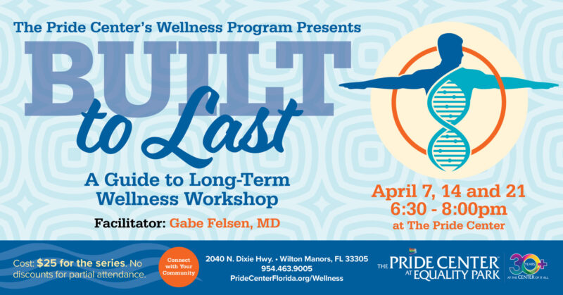 April 7, 14 & 21 | 6:30 to 8:00 pmThe Pride Center at Equality Park$25 for the full series Ready to invest in your long game? Built to Last is a three-part wellness workshop designed to help you live longer, stronger, and more intentionally. Led by Gabe Felsen, MD, this series explores the science, movement, […]