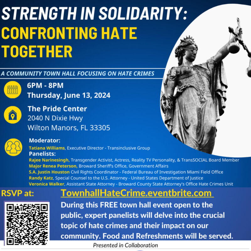 Community town hall focused on hate crimes, hate speech, and community safety within Broward County. Please join the Broward County Hate Crimes Task Force and Broward State Attorney’s Office together with Transinclusive Group , The Pride Center, the U.S. Attorney’s Office for the Southern District of Florida, Broward Sheriff’s Office (BSO), FBI and many other partners for an impactful #community town hall event next […]